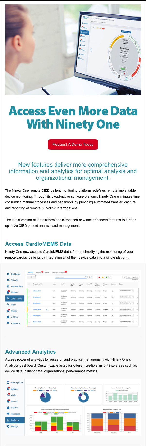 Approach: Led the design and content direction for a corporate website overhaul —advocating for a clean, modern interface under a modest budget. Applied human-centered storytelling and problem-based messaging to campaigns, shifting focus from features to real-world clinician challenges. A continuous content feedback loop was also implemented through newsletters and product-feature emails.